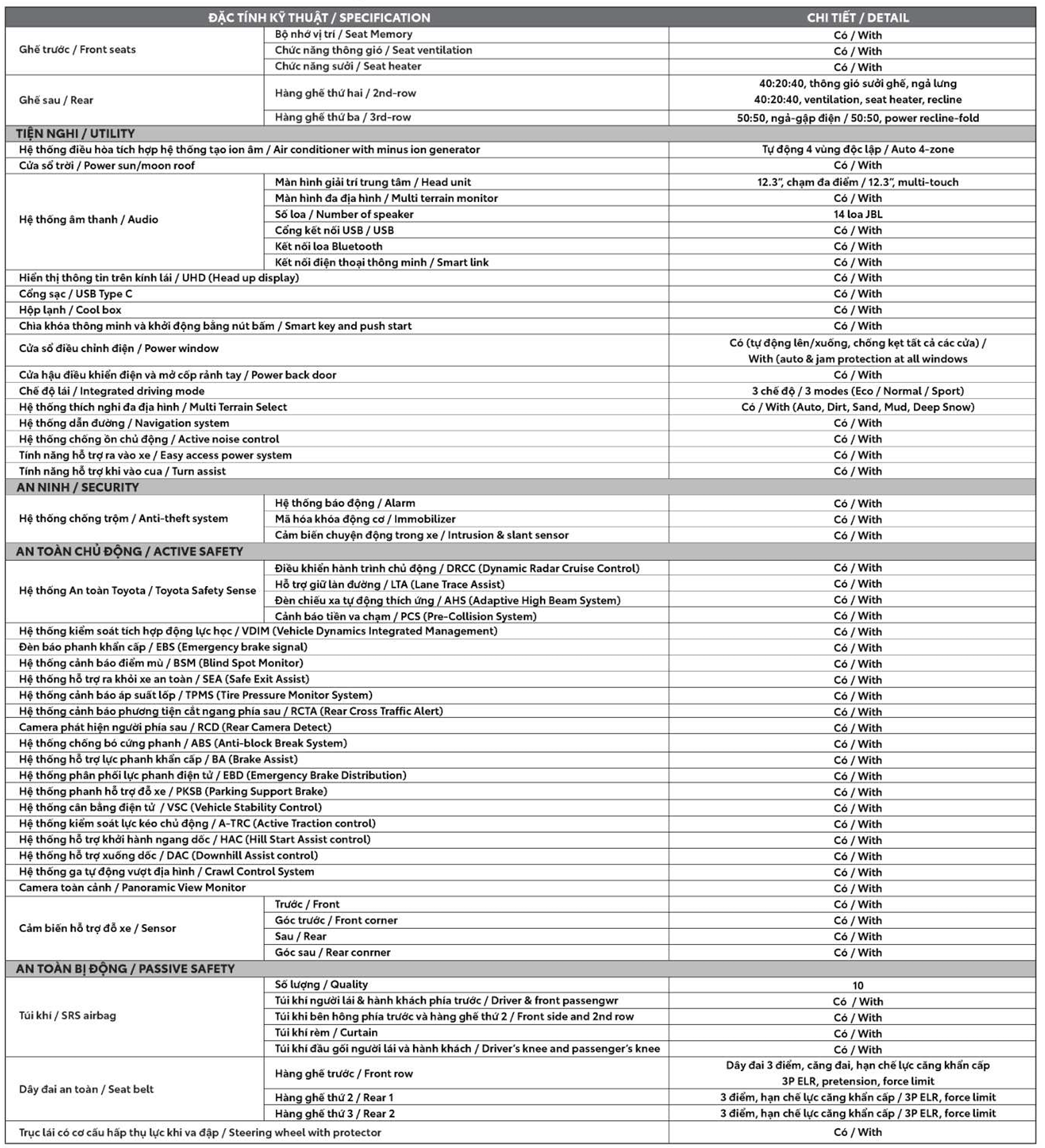 Land Cruiser đời mới được trang bị động cơ V6 dung tích 3,5 lít tăng áp kép hoàn toàn mới, cho công suất 409 mã lực và mô-men xoắn 650 Nm. Hộp số tự động 10 cấp. Mẫu xe này có thêm cảnh báo điểm mù cùng gói Safety Sense với những tính năng như cảnh báo va chạm sớm, ga tự động thích ứng, báo lệch làn đường, đèn pha tự động. Cảm biến trước/sau tổng cộng 8 chiếc. Số lượng túi khí là 10.